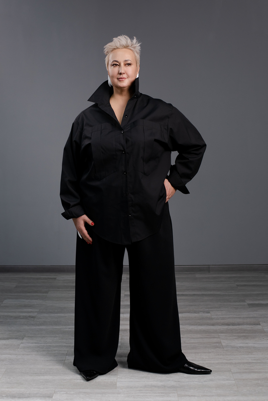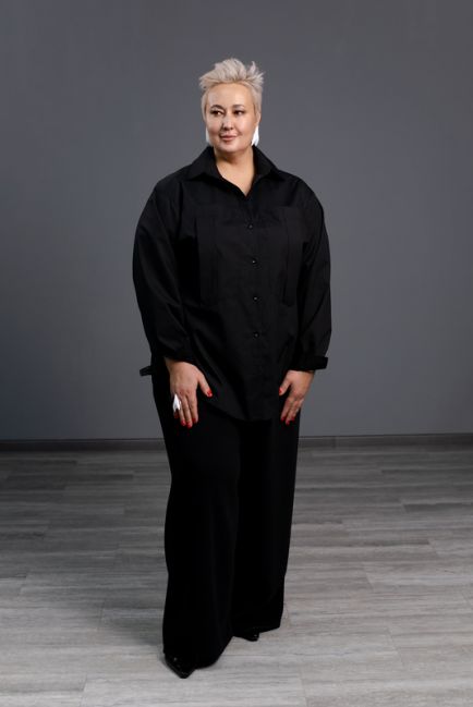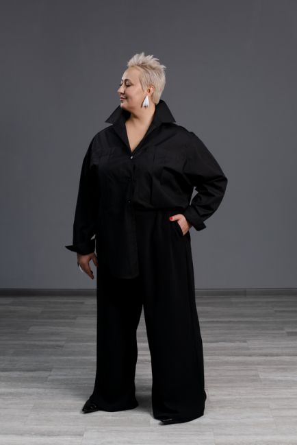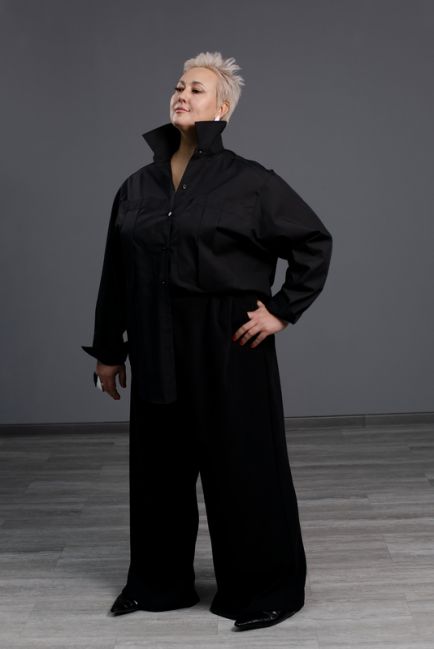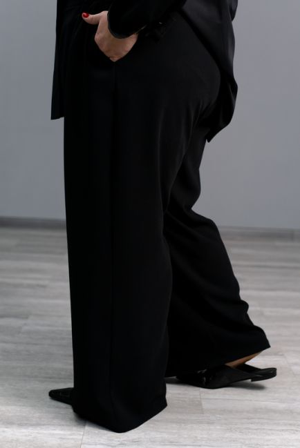- Модель отлично скрывает объемы и особенности фигуры: за счет широкой штанины ноги кажутся стройнее, а благодаря посадке и поясу на резинке зрительно корректируется объем живота