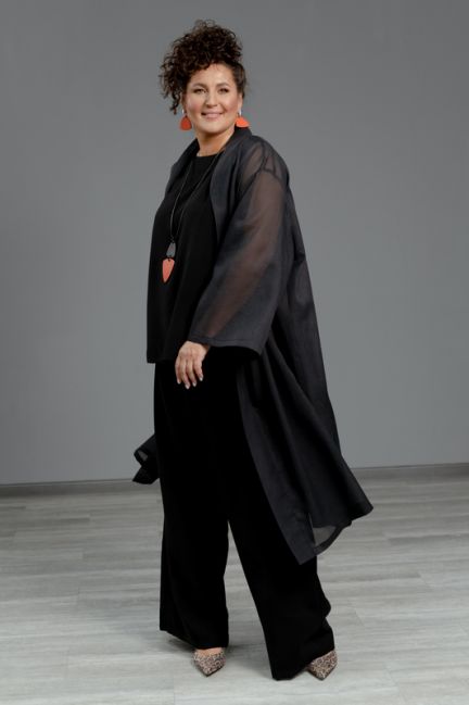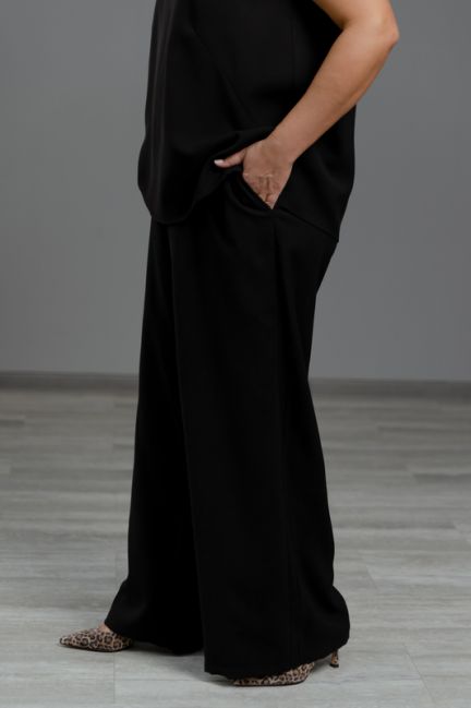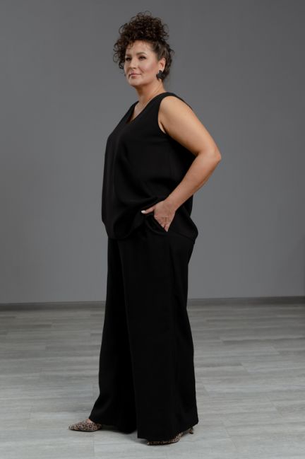 - Модель отлично скрывает объемы и особенности фигуры: за счет широкой штанины ноги кажутся стройнее, а благодаря посадке и поясу на резинке зрительно корректируется объем живота