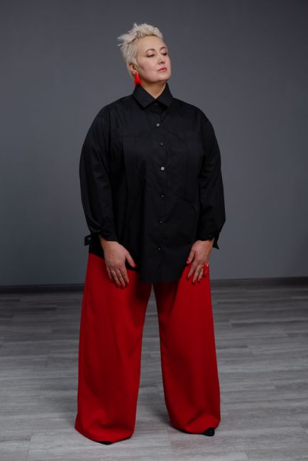 - Модель отлично скрывает объемы и особенности фигуры: за счет широкой штанины ноги кажутся стройнее, а благодаря посадке и поясу на резинке зрительно корректируется объем живота
