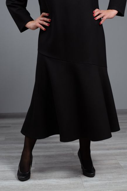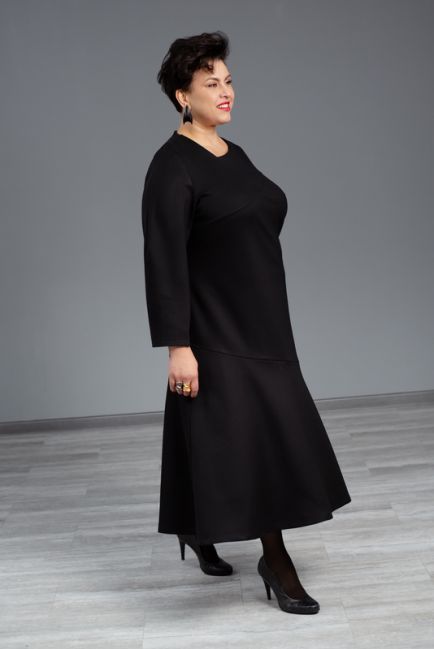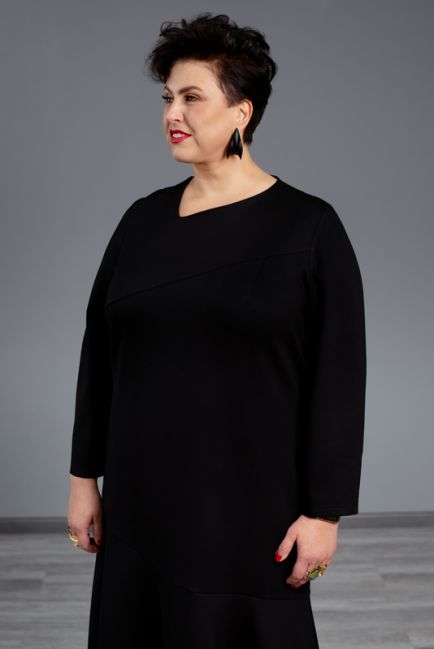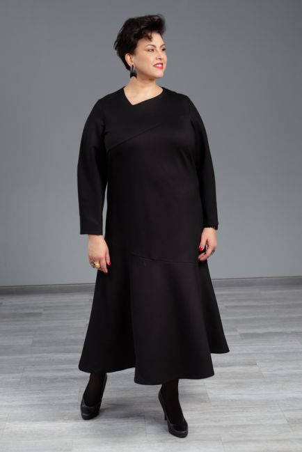 - Имеет асимметричный вырез, красиво удлиняющий шею