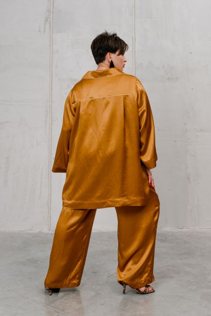 - Объемная рубашка из шёлкового атласа с небольшим скругленным воротником с лацканами