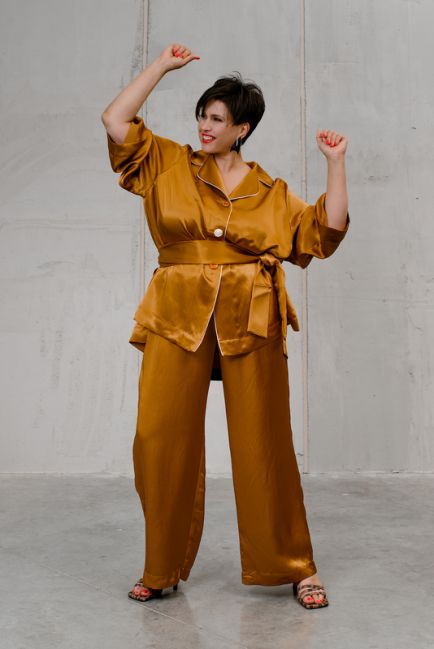 - Изделие можно носить с поясом под любой низ, либо выбрать из нашей атласной линии юбку или брюки такого же или контрастного цвета
