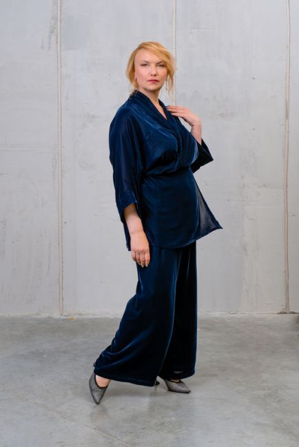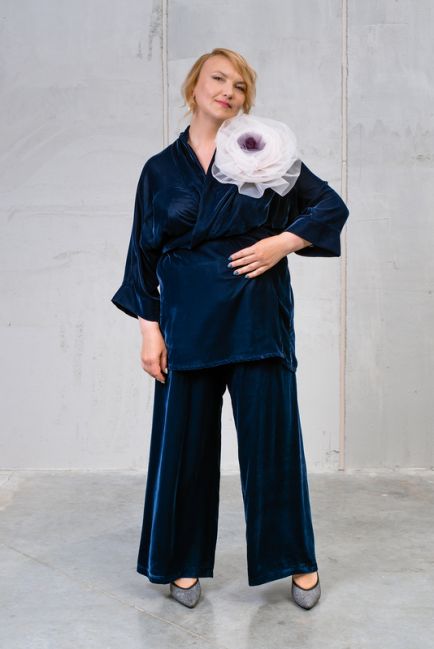 - Модель отлично скрывает объемы и особенности фигуры: за счет широкой штанины ноги кажутся стройнее, а благодаря высокой посадке и поясу на резинке зрительно корректируется объем живота