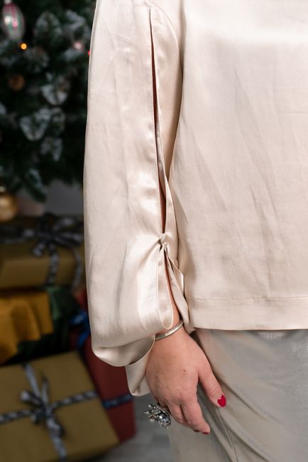 - Широкие рукава оформлены разрезом с пуговичками из атласа, позволяющими носить это изделие в разных вариантах