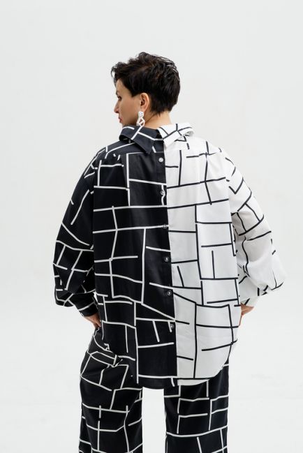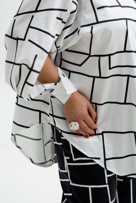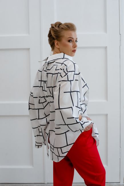 - Немного расклешенный силуэт рубашки изящно формирует талию и бедра
