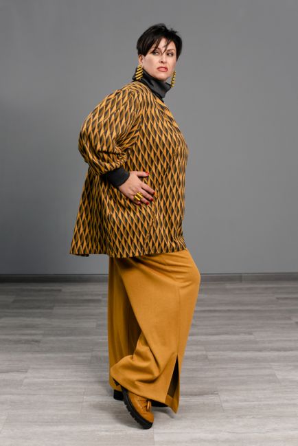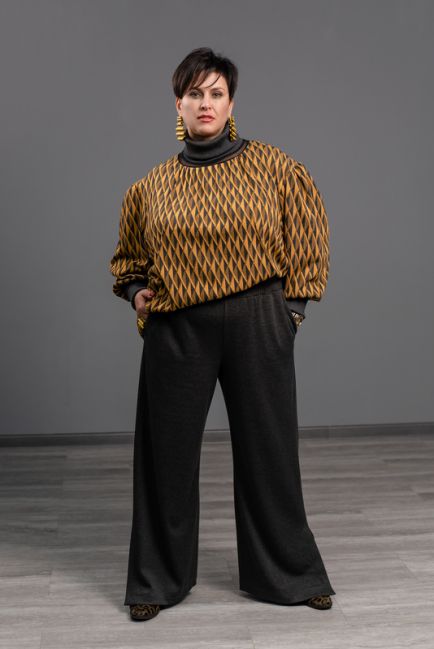 - Широкий объем сверху сбегает к зауженному низу для правильного силуэта фигуры