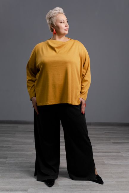 • Мягкий вырез "лодочкой" вытягивает шею и придаёт нежность плечевому поясу. Небольшой объем можно заколоть брошью или оставить в свободном полёте