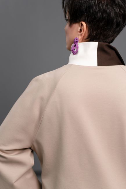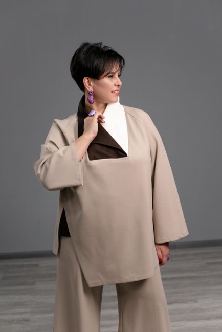 - Асимметричный низ с высоким разрезом справа не только стройнит, но и позволяет комфортно использовать карман на наших брюках-клешах, созданных в пару к этому свитшоту