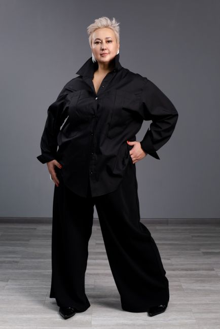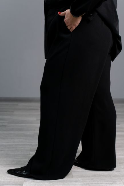 - Модель отлично скрывает объемы и особенности фигуры: за счет широкой штанины ноги кажутся стройнее, а благодаря посадке и поясу на резинке зрительно корректируется объем живота