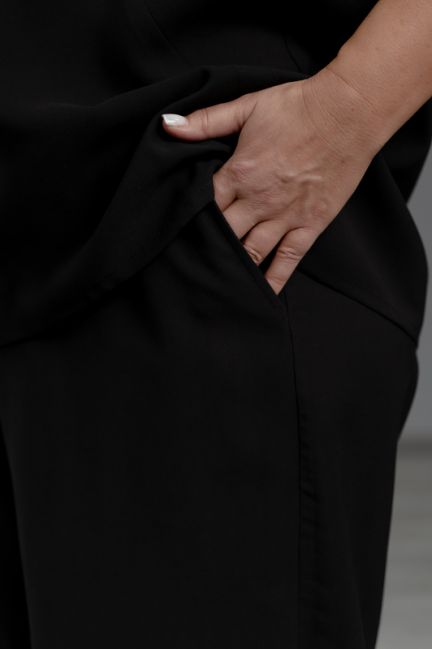 • Модель отлично скрывает объемы и особенности фигуры: за счет широкой штанины ноги кажутся стройнее, а благодаря посадке и поясу на резинке зрительно корректируется объем живота