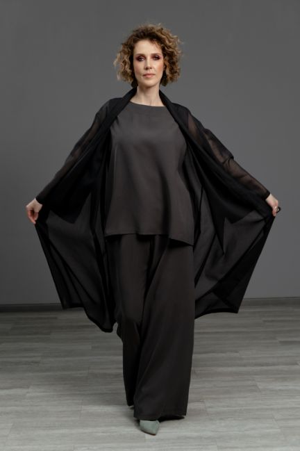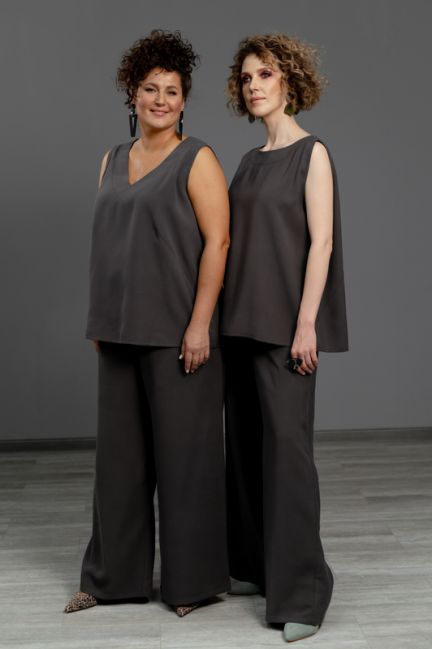 - Модель отлично скрывает объемы и особенности фигуры: за счет широкой штанины ноги кажутся стройнее, а благодаря посадке и поясу на резинке зрительно корректируется объем живота