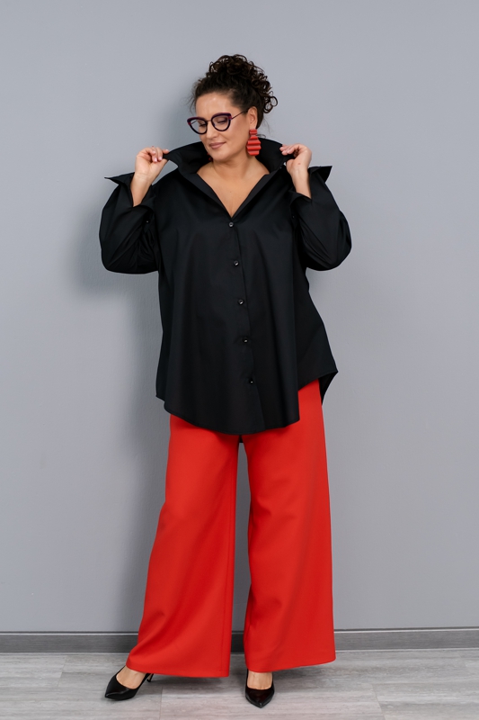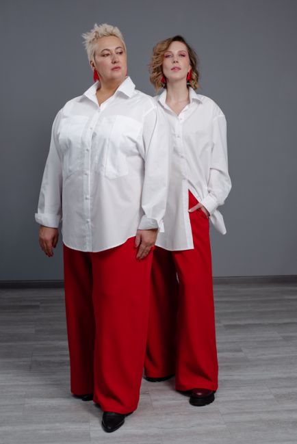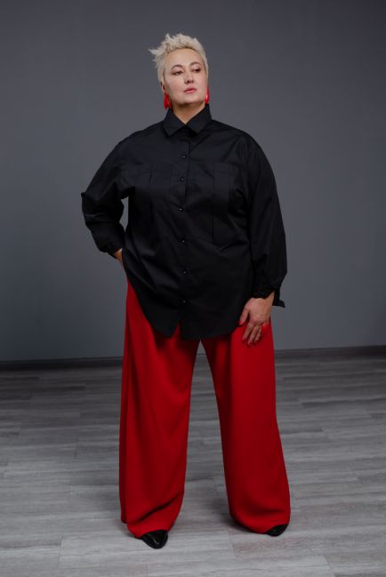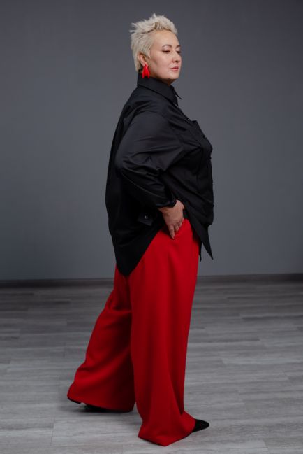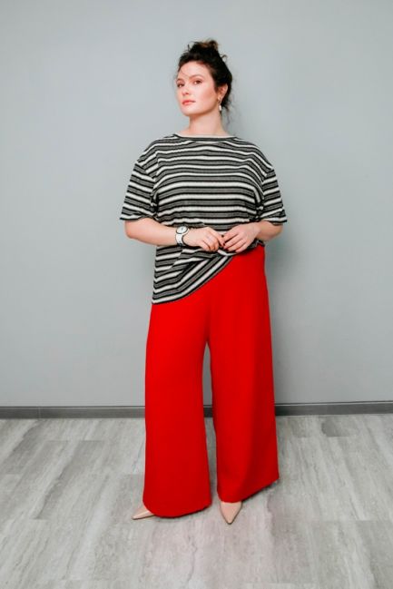 - Модель отлично скрывает объемы и особенности фигуры: за счет широкой штанины ноги кажутся стройнее, а благодаря посадке и поясу на резинке зрительно корректируется объем живота
