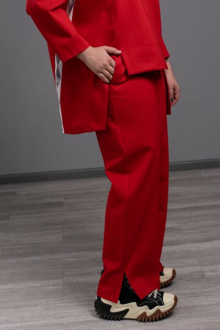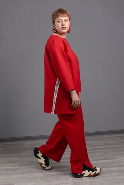 - Модель отлично скрывает объемы и особенности фигуры: за счет широкой штанины ноги кажутся стройнее, а благодаря высокой посадке и поясу на резинке зрительно корректируется объем живота