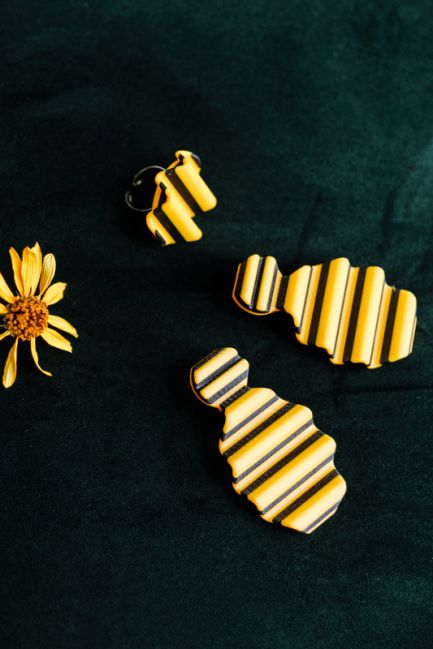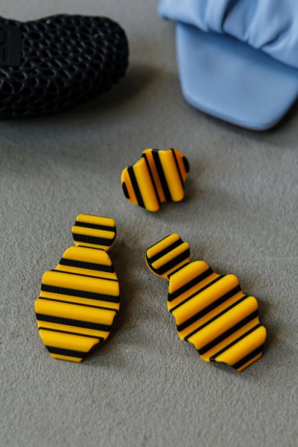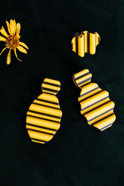 Комплект из пары сережек и кольца черно-желтой расцветки