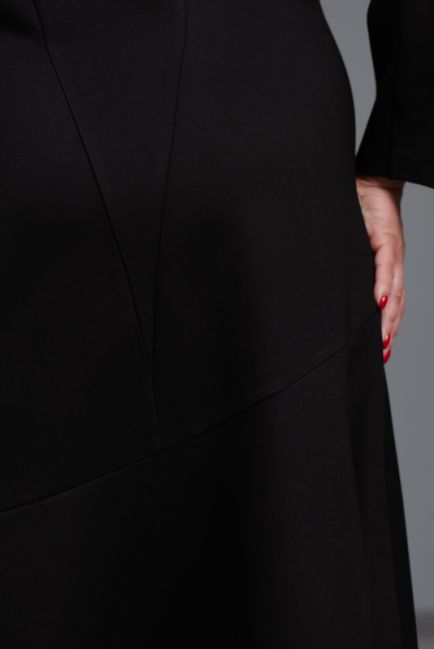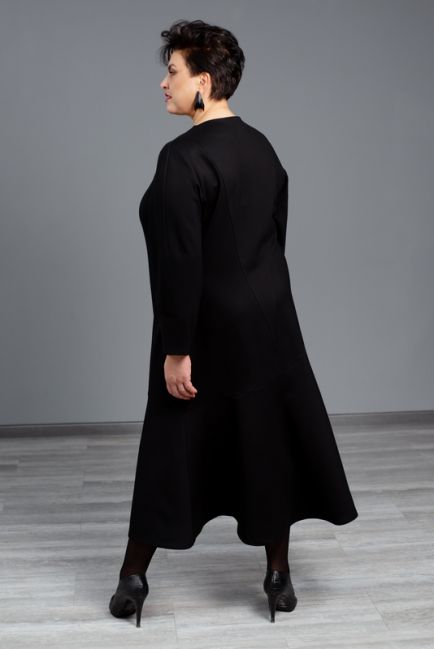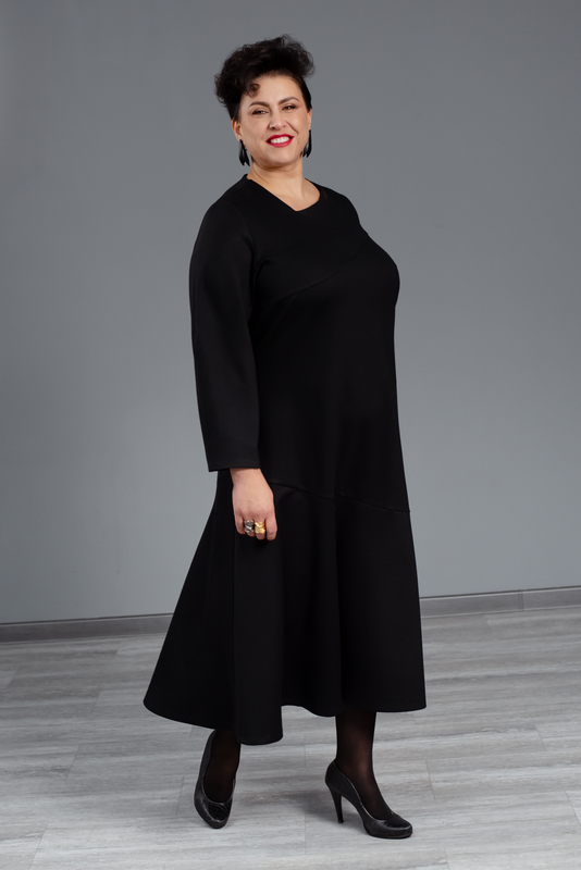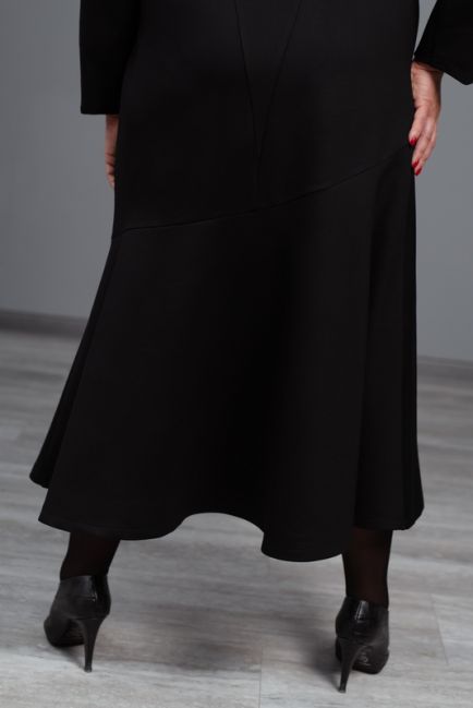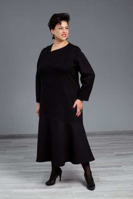 - Имеет асимметричный вырез, красиво удлиняющий шею