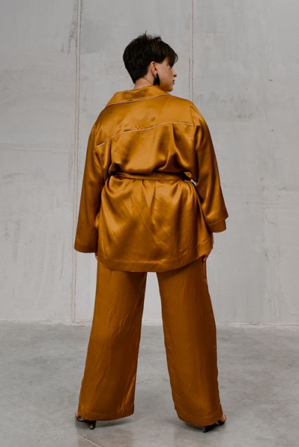 - Изделие можно носить с поясом под любой низ, либо выбрать из нашей атласной линии юбку или брюки такого же или контрастного цвета