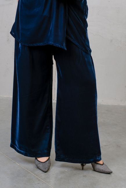 - Модель отлично скрывает объемы и особенности фигуры: за счет широкой штанины ноги кажутся стройнее, а благодаря высокой посадке и поясу на резинке зрительно корректируется объем живота