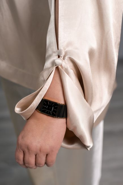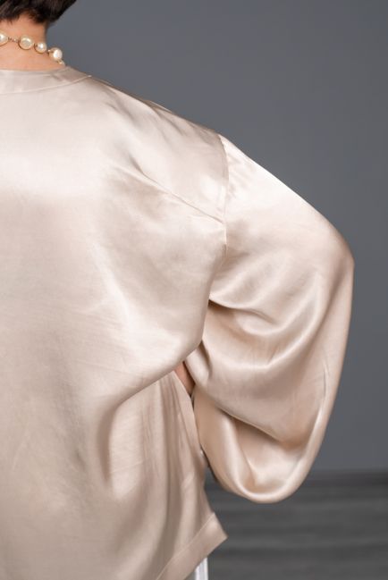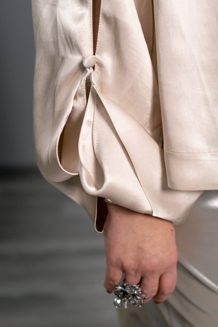 - Широкие рукава оформлены разрезом с пуговичками из атласа, позволяющими носить это изделие в разных вариантах