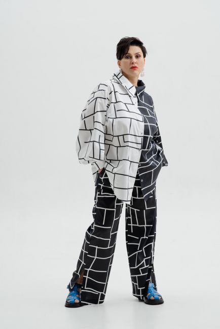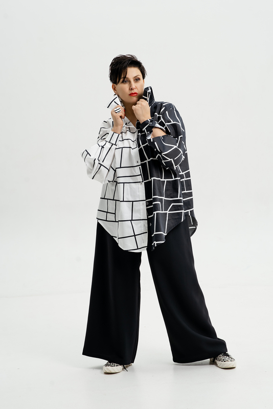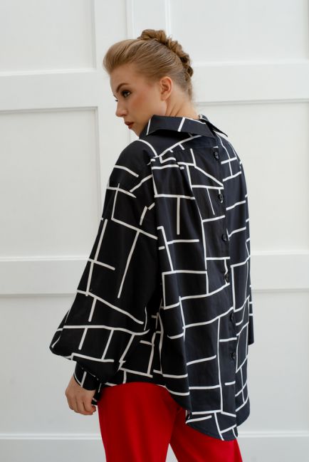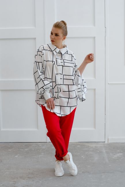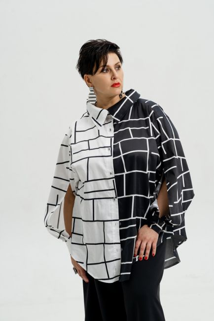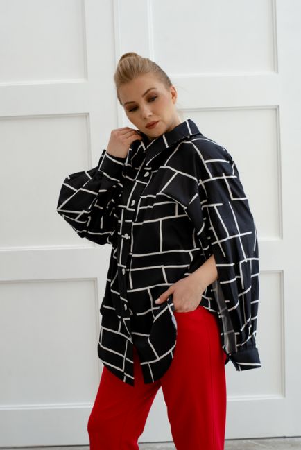 - Немного расклешенный силуэт рубашки изящно формирует талию и бедра