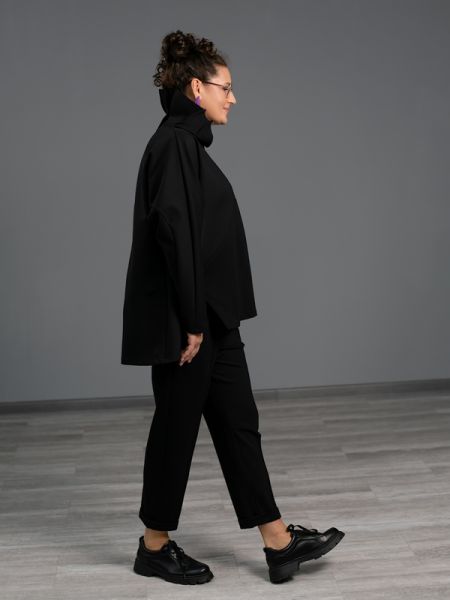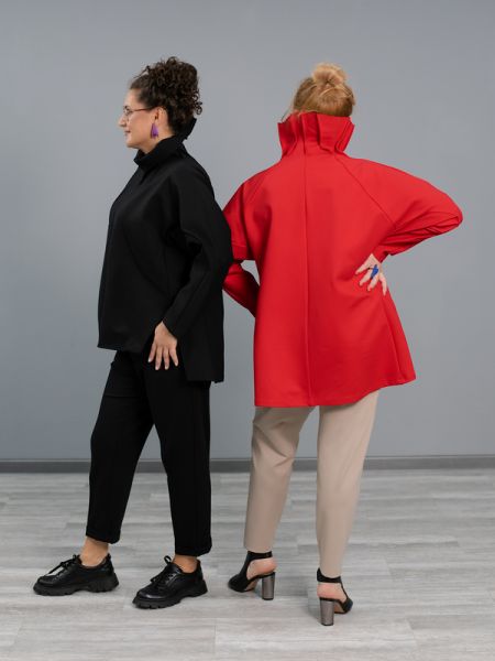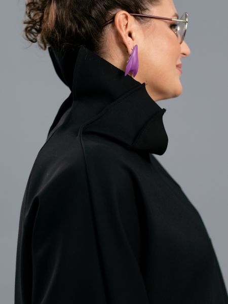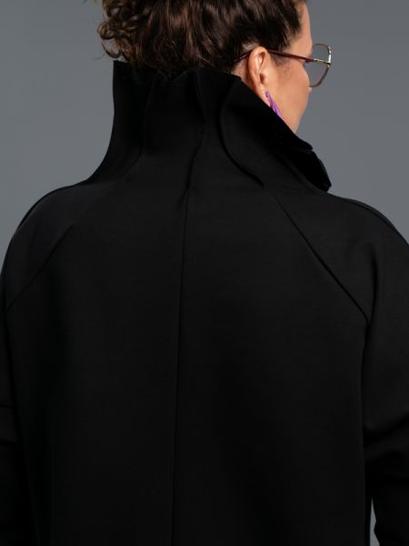 - Воротник позволяет моделировать любые варианты носки: при поднятом воротнике мы получаем строгие линии воротника стойки. Можно отогнуть только спереди и получится более свободный вариант. Или вариант - полностью отогнутый воротник - и вот уже шея красиво обнажена