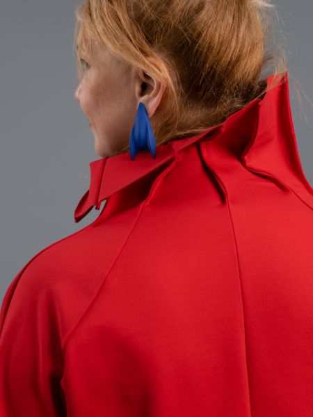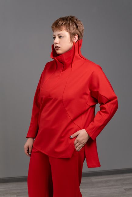- Воротник позволяет моделировать любые варианты носки: при поднятом воротнике мы получаем строгие линии воротника стойки. Можно отогнуть только спереди и получится более свободный вариант. Или вариант - полностью отогнутый воротник - и вот уже шея красиво обнажена