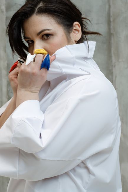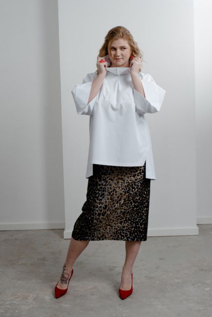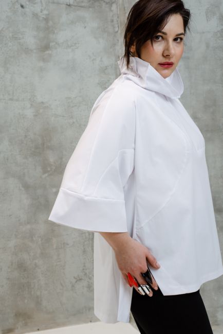 - Особая наша гордость - конструкция воротника-стойки. Топ легко одевается. Воротник красиво стоит, не стесняет движения головы и шеи. Конструкция воротника красиво оформляет лицо. Воротник можно подвернуть на любую сторону, создавая новые образы